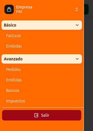 Si tiene más de una empresa configurada en el sistema principal, podrá cambiar de empresa usando el botón de selección superior en el menú, para generar facturas o consultas de la empresa correspondiente.