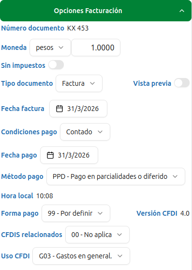 Forma pago : Si la factura es de tipo PUE, podrá seleccionar la forma en que le están pagando la factura en ese momento. Si es PPD, solo podrá seleccionar "Por definir", ya que la forma de pago final se verá reflejada en ese momento y deberá emitir un documento de pago subsecuentemente.