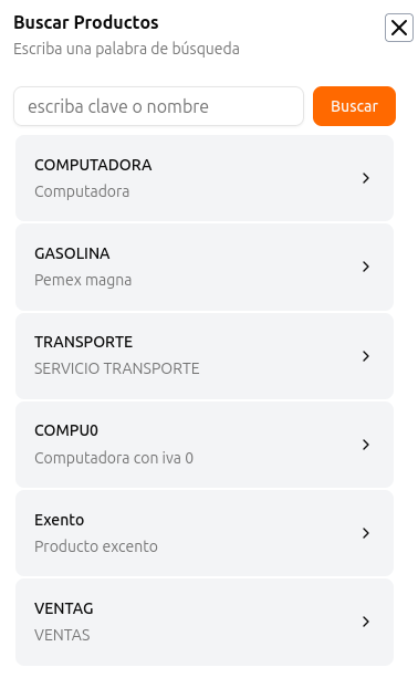 Al presionar "Agregar producto o servicio" se abrirá un nuevo formulario de búsqueda, el cual presentará el campo de búsqueda de productos y la lista de sus productos favoritos similar al formulario de facturación básico en la computadora. La lista contiene los productos que factura con más frecuencia ordenados del más utilizado al menos utilizado.