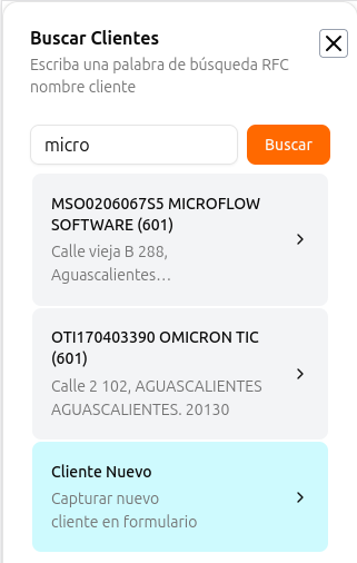 Al buscar por nombre o RFC aparecerán los clientes que coinciden con los datos buscados y la opción de dar de alta uno nuevo si no aparece el que busca.